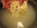 手で少しずつ引っ張りながら5mmの太さにし、別の容器に渦巻き状にする。30分寝かせると一本麺の完成。