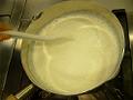 鍋に残りの豆乳と塩、砂糖を入れて混ぜ、6を加えて中火にかける。でんぷんが沈殿しないようにヘラで混ぜ、とろみがついてきたらしっかり練る。