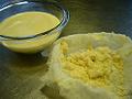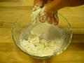 小麦粉はふるっておく。小麦粉〜ベーキングパウダーまでをボウルに入れて混ぜ、分量の水を少しずつ加えながら練ってリボン状に落ちる固さにする。最後に分量の油を加えて混ぜる。