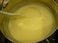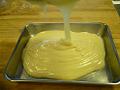 ヘラからボテッとたれるような濃度になれば、薄く油をひいたバット(20cm×24cm)に流し入れる。粗熱が取れたら冷蔵庫で冷やし固める。