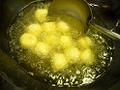 切った豆腐に薄く片栗粉(分量外)をまぶし、衣をつけ、165℃〜170℃の油に入れ、表面が固まれば取り出し、油の温度を上げ、再び入れてカリッと揚げる。