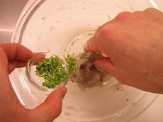 むきエビはすり身にし、味つけ調味料を加えてよく混ぜ、軸ごとみじん切りにした香菜を加えて混ぜる。