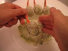 ナッツ類をみじん切りにしてパン粉と混ぜ合わせ、合わせパン粉を作り、カニ爪の周りにしっかりとつける。