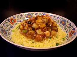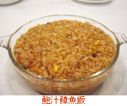 鮑汁鱆魚飯(パウチャップチョンユィファン)。中国高級食材の一つに数えられる乾鮑(干し鮑)を戻す時の旨みをたっぷり含んだ煮汁(鮑汁)で味付けした炒飯です。残念ながらアワビは別の料理に使いますが、代わりに干しダコが入っています。煮汁を加えるのでリゾットに近く、炒飯はパラパラにするという固定観念を覆すシットリとした状態に仕上がります。煮汁の奥深い味と干しダコのプチプチした触感がなんともいえません。