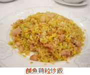 一口に炒飯といっても色々な種類があり、中には一風変わったものもあります、例えば鹹魚鶏粒炒飯(ハムユィガイラップチャウファン)。鹹魚と鶏肉が入った広東料理でおなじみの炒飯です。鹹魚とは塩漬けの魚の事で、お腹の中とエラに塩を詰め発酵させてから天日干しにしたものです。発酵食品なので、調理するまでかなり個性的な臭いがしますが、ひとたび炒めると香ばしい香りと旨みに変わります。好きになると病み付きになる味で、炊き込みご飯に入れたり、ミンチと共に蒸したりもします。
