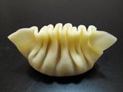 焼き餃子形・・・すでに焼き餃子の定番となっているこの形ですが、実はたくさんあるひだには、餃子を焼いた時に膨張する餡と一緒に生地が伸びる余裕を持たせるという役目もあるのだそうです。