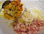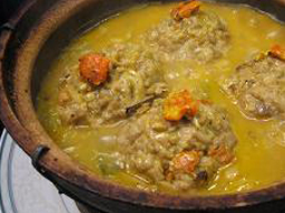 今回の料理は「蟹粉獅子頭」という料理です。以前私が働いていたお店、東京吉祥寺「知味 竹爐山房」(コラム「パラパラチャーハンが食べたいな」の項参照)で作っていた料理です。揚州の名菜に大きな肉団子を土鍋で煮込んだ料理があります。「清燉獅子頭」といいますが、今回の料理はこれに上海蟹を加えたものです。「獅子頭」と言うのは大きな肉団子で、揚州に古くから伝わる料理です。あっさりしていて箸で取ろうとすると、崩れそうなほどふわふわしている、やわらかくお年寄りにも喜ばれる料理です。土鍋に入った肉団子が今にもほえ立てそうな獅子の頭に見えたのでこの名が付いたと言われています。家庭で長時間加熱するのは手間だとは思いますが、天下一品の名菜を是非作って味わって見て下さい。