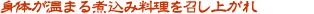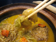 土鍋の煮込み方で気を付けて頂きたい所があります。土鍋は熱伝導が悪く、鍋底に熱がたまりやすく焦げ付きやすいのです。そこでクッキングシート、鉄皿、または白菜などの葉野菜を鍋の底に敷くとくっ付いてこげることがありません。火加減は、弱火でコトコト煮込むようにします。最初はなかなか温度が上がらないので気をもみますが、逆に強火にすると今度は土鍋が熱くなり過ぎた時に温度が下がるのに時間がかかりますので焦げる恐れが・・・。やはり、ゆっくりと温度を上げるように加熱して下さい。鍋の大きさ、形によって煮込み時の水分蒸発量が変わりますので、蒸発したら小まめに水分を加えて下さい。沢山作り過ぎて余ってしまった時は、粗熱を取り冷蔵庫で保存。一晩置くと味が浸み込みおいしくなります。再び食べる時に電子レンジで温め直すと早く中心まで温まります。2〜3日はおいしく頂けると思います。