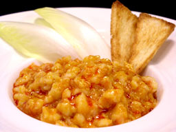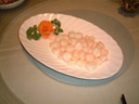 本場の味を求めて四川に行きました。内陸部なので、えび料理といえば河えびを使いますが、身が海のものより柔らかいのが特徴です。残念ながらチリソース煮込みは出てこなくて、食べたのは塩味のあっさりした炒めもの(写真左)でした。辛い料理が続き、しかもその辛さといったら口から火がでそうなほどだったので、あっさり味にほっとしていました。 |