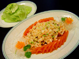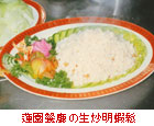 今回のエビの炒めもの(生炒明蝦鬆)は研修時の思い出深い料理です。店では、副材料は揚げパン(油条)、黒クワイだったのですが、更なるおいしさを求めて、香りのセロリ、シイタケ、歯触りのタケノコ、彩りに枝豆を加えてみました。レタスに包んで食べるので、あっさりといくらでも食べられます。是非、試してみて下さい。