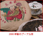 | プーアル茶はビンテージものというか、長く寝かしたものほどよいといわれていますが、最近は年代ものが少なくなってきました。それで、西暦2000年に作られたプーアル茶を自分達で育てようと香港のお茶屋さんが円盤状の餅茶を売り出しました。お茶マニアはそれを買って大事に熟成しています。私も辻調理技術研究所にひとつおいて熟成させています。 |