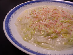 北京の冬の代表的な野菜といえば白菜です。通りに白菜の山が築かれ、売られています。白菜のクリーム煮には柔らかく甘味がある芯の方を使います。外側は繊維質が硬いので、2〜3枚はずして他の料理に。色が青いのは硬く、白、黄色のものの方が断然おいしいのです。