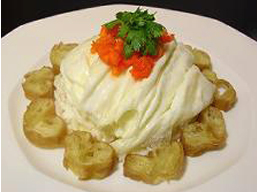 卵料理は強火で短時間で仕上げるのが良いと言われます。弾力があるものに仕上がります。今回の卵白炒めの技法は研修時代のマンダリンホテルの料理長、林勝倫氏が考案したものです。私にとって目から鱗が落ちる思いの料理でした。卵は子供からお年寄りまで好まれる食材ですし、卵を使った料理はたくさんあります。栄養分もたくさん含まれています。卵料理は強い火でまごまごせずに一気に仕上げてください。そうすればプルプル、フワフワで好好食(ホウホウセッ:めちゃ美味しい)!!