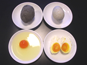 鳩の卵は鴿蛋(ガップタン)と言います。他の卵と違う所があり、ゆで卵にして殻をむくと、白身が真っ白ではなく透明感のある白色に固まっており、なんと鮮度の良いものは黄身が透けて見えます。鮮度が良くないものは白身に透明感がなく、黄身は見えません。これで鮮度の良し悪しがわかります。また、白身は、ゆでた鶏卵はプリプリしていますが鴿蛋はモチモチしています。鶉卵も鮮度の良いものは微かに黄身が透けて見えますよ。お試しあれ!