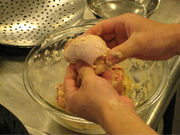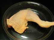唐揚げの美味しさは何と言っても、あのジューシーな肉汁です。その肉汁を外に逃げないようにするのは皮です。また、骨があるとそれがちょうどつっかえ棒みたいになり、肉の縮みを少なくします。結果ジューシーに仕上がるのです。だから全体を皮で被われて、骨があるモモ肉は唐揚げにとっては理想的といえます。でも、今回は食べやすさや、家で作る場合に骨を断ち切る包丁が必要になるため、それは大変面倒なので、手軽な鶏モモ肉開き(骨無し)を使います。