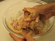 一般の唐揚げの衣は中国では軟炸糊(ルワン ヂャー フゥ)といわれ、卵、水、小麦粉、片栗粉で作ります。小麦粉、片栗粉の割合は様々ですが、小麦粉の割合が多いと軟らかく仕上がり、片栗粉が多いとカリッと仕上がります。また、卵の割合が多いとふっくらした衣になります。今回は少量の卵と水、片栗粉のみを使います。衣の量は極端に多いとカリッとはなるが香りが出にくく、逆に少ないとカリッと感が持続しません。程よい量が大切です。程よい量かどうかは文ではなかなか説明しにくいので写真を参照してください。