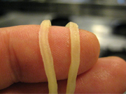 麺を指でつぶして 芯が残っていないのを確認 左:芯が残っている状態 右:芯のない状態 |