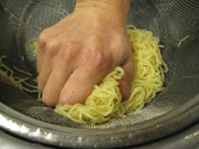 麺をギュッと握り、水分を搾り出す |