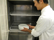 当然フロアーから下げられた器は急いで洗い、すぐに冷やさないとならないんです。ある日、忙しさにかまけて器を冷やすのを忘れてしまい、先輩にひどく怒られたことがあります。至極あたりまえの話ですが、一流店では炒め物など熱い料理は熱く、前菜など冷たい料理は冷たく提供する事にこだわります。無論、器にも気を配ります。熱い料理を盛るときは器も保温器に入れ、十分熱くしておきます。冷たい料理のときには器を冷蔵庫に入れ、ガンガンに冷やします。基本的なことですが、これがとても重要なことです。料理人は細やかな気配りが必要だと学んだ一件でした。店の仕事は切り方ひとつとっても丁寧にやらないと叱られます。かといって、ゆっくり切っていたら仕事になりません。多くの作業に追われて少し仕事が雑になりかけたときに、寡黙な料理長(山本豊氏)からいつもにっこり一言「一刀一魂」と声をかけられます。一つ一つの仕事にそのつど気持ちを込めて材料を切る。辻調理師専門学校に移った現在でも心がけていることです。