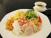 先ず麺ですが、中華生麺なら何でもOKです。麺の太さは好みにもよりますが、あまり細すぎないものが、腰があっていいと思います。次に具材の野菜ですが、定番は胡瓜ですね。胡瓜は体の熱を散らす効能があるといわれ、暑い季節にうってつけです。しかし、決まりはなく、サラダの材料にするようなものなら何でもよいと思います。例えば、カイワレ菜、水菜、レタス、紫タマネギ、トマトなど(材料例1)。彩りなどを考え、好きに組み合わせてください。野菜以外の具材としては、火を通した鶏肉、ロースハム、クラゲや、エビ、イカ、ホタテなどの魚介類など(材料例2)。ほかは刻んだピーナッツ、カシューナッツとか雲呑の皮を揚げたものとかを散らしたりしても風味が増します。