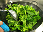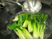 野菜と油は相性が良いので結構多めに使います。でも、それだけの理由で油を多量に使うわけでもありません。油は熱を上手く野菜に伝え、高温を保つ役割があります。「ダイエットしているから」といって熱の媒介となる油を減らすと、鍋の熱が野菜に伝わらず、風味よく炒めることができません。火の通りにもむらができます。油をけちけちしてはいけません。だからといって使いすぎると、重たい口あたりになるのでほどほどに。香港の野菜炒めは、油にピーナッツ油を使うので、とても風味がよいのです。手に入ればいいのですが、なければ紅花油や白絞めゴマ油など香り高いけど、くどくない油で炒めるといいと思います。