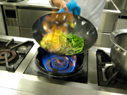 葉野菜など炒める場合に、「高火力でかつ短時間に炒める」とよくいいますね。確かにそうです。低火力でも適当に時間を調節すれば見た目には同じものができます。しかし、食感がまったく違います。香りもぜんぜん弱い!野菜を炒めると、野菜から出た旨味成分が焼けることによって風味が出ますが、低火力で炒めると野菜からたくさんの水分が出て鍋の表面温度が下がってしまい、結果、香りをたたせることができません。また、長時間加熱すると繊維も壊されシャキシャキ感がどんどん失われていくのです。やはり高火力で水分を飛ばしながら短時間に一気に炒めることによって、野菜の持ち味を生かし、繊維を壊さずシャキシャキの野菜炒めを作りことができます。家庭の場合では火力に限界があるので、一回の量を考えて炒めるようにしましょう。欲張らず数回に分けて炒めるといいでしょう。