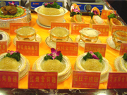 広東料理店内に展示している 料理サンプル。高級食材のフカヒレ、 海ツバメの巣などが並ぶ。 |