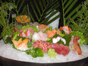 刺身の盛り合わせ(260元=約4000円)。 中国人好みのディスプレイ、 馬刺しも見える。 |
