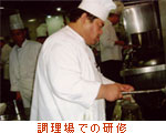研修は「中国の名店100選」にも名を連ねる由緒あるレストラン「卞氏菜根香酒楼」と「錦官驛酒楼」で行われました。「菜根香」は客席数が約150あり、調理場では30人近くの人が働いており、女性も活躍しています。四川料理の店ですが、直径49cmのやや浅い鍋、布巾のたたみ方、鍋の持ち方、料理を作る度にササラで洗うという鍋の使い方、そして料理を作る流れは広東料理のレストランのようでした。料理長が解説をしながら料理を作り、試食をするという形で約10品作って頂きました。 |