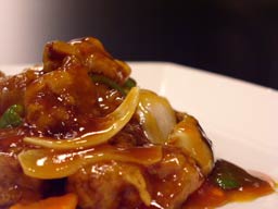 | 最後に、当時のマンダリンでは、「酢豚」はメニューにありませんでした。お客様から注文がくると作ることもありましたが、フルーツ(生果)とエビを組み合わせた「生果蝦球」をメニューにだしていました。揚げたエビにパイナップル、ピーマン、赤ピーマンを合わせ、甘酢あんに絡めたもので、汁気がちょっと少ない仕上がりです。もちろんこの料理も「トロ〜ッとサクッ」がポイントです。 |