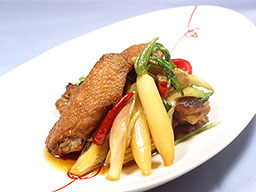 実は、この料理は北京料理店で研修した先生のうろ覚えで、生粋の「山東焼鶏」ではないかも知れません。作りやすくアレンジし、野菜も一緒に漬けてヘルシーに仕上げました。大葉、茗荷、バジル、ミントなど香りの強いものがよく合いますよ。 |