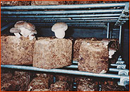 11月から3月の商品作物のひとつは椎茸で、菌がついたおがくずを固めて15cm角の ポットに入ったものを仕入れます。菌床椎茸といい、これらを3千個並べたハウスは、大型の暖房器具で常に20℃前後の温かさに保ち、雪の降り積もっている外とは別世界を作りだしています。朝晩水をやり、3週間たつと収穫できます。その日の内に農協や大型スーパーに卸すので、まだ日が昇らない3、4時に起きて昼までが勝負です。時期を逃すと椎茸はすっかり傘を開いてしまい、商品価値がなくなります。 |