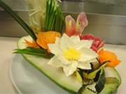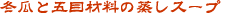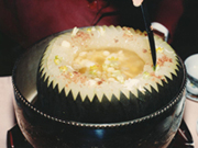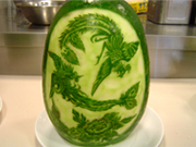 は余りありませんが、繊細な彫刻を施してテーブルの飾りとして出されたり、台湾では内部にひびかないように切り込みの浅い飾りが入れられたりすることもあります。また、冬瓜の食べ方には2通りのサービス方法があります。ひとつは、ある程度スープがなくなると、その部分の冬瓜を大きく切って別皿に盛り、塩を振ってスプーンで身をすくいとって食べます。もう1種類は、冬瓜の肉を削り取りスープの具として、スープと一緒に小碗に取り分けるのです。