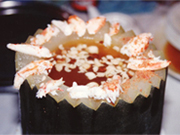 冬瓜の切り口の飾り包丁をよくご覧下さい。切り口の表面にギザギザを入れている店もあるのですが、上に飾りの材料をのせるので、マンダリンでは外側に切り込みを入れています。冬瓜は口一杯までスープを満たしておくのですが、スープが蒸発すると液体に接していない部分の水分が抜け、外側の皮は変化しないので、当然身の部分が凹むことになります。上を真っ平らにしておくと凹みにくいという利点もあります。