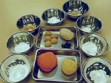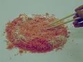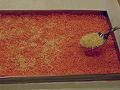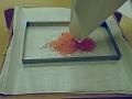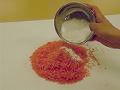 200gの白こし餡を紅色の食用色素で、100gの白こし餡を黄色の食用色素でそれぞれ着色する。白紙の上にそぼろごし(2mm角)をのせ、各色の餡をのせ、それぞれを手でこし、そぼろ状態にする。上白糖、上新粉、餅粉を合わせたものを混ぜ合わせる。