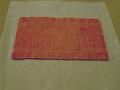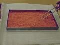 逆さにしたせいろに乾いたさらしを敷き、クッキングシートを重ね、その上に蒸し物枠(8cm×30cm)をのせて、紅色の村雨生地を入れる。