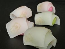 男性の恋の心情をお菓子に表現しました。女性を思う男性のせつなさを感じ、冬のお菓子にしました。外郎生地を薄くのばして袖に見立て、契り(誓い)を表現しています。