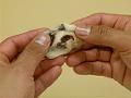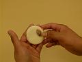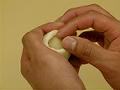 残りの練切生地を1個25gずつに分割し、4の小豆粒餡入り生地を1gずに分割する。練切生地に小豆粒餡入り生地をはり合わせて、小豆粒餡入り生地の周囲を指でぼかす。