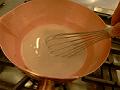 グラニュー糖、小豆こし餡を加え、中火にかけ、全体がなじむように泡立て器で混ぜる。