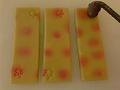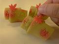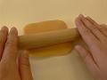 こなし生地を基本技法の約1.2倍で作る。150gのかたまり2つと、50gのかたまり1つに分割し、150gのかたまりは、黄色と挽き茶色で、50gのかたまりは本紅色で、それぞれ着色する。表面に片栗粉をつけながら、黄色のこなし生地を麺棒で3mmほどの厚さにのばす。