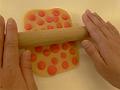 赤のこなし生地が平らになるように、麺棒でのばす。