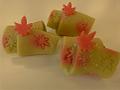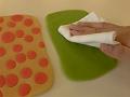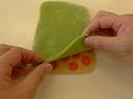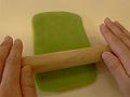 緑色のこなし生地を、8のこなし生地と同じ大きさにのばす。緑色のこなし生地の表面にシロップを薄くぬる。