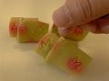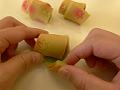 14で抜いた葛焼きを、13の生地を裏返した中心におき、巻くように成形する。