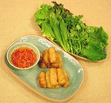 | ライスペーパーを使った料理の一つですが、この料理には2つの呼び名があります。ベトナム南部ではチャーゾーと呼び、北部ではネム・サイゴンとかフランス語風にル・ネムなんて言われています。好みの具をライスペーパーに包み、油で揚げた味わいのある香ばしい料理です。この料理には、やっぱりベトナムのビール333(バーバーバーと読みます)が良く合いますね。 |