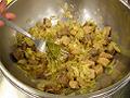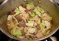 玉ねぎ、キャベツ、タイム、ローリエを加えて炒め、中火の オーブンに10分ほど入れて火を通す。