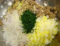 9の肉を挽いてボウルに移し、春雨、固ゆで卵、ディルの葉を加えて混ぜ、塩、こしょうで味を調える。