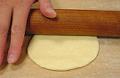 軽く粉をふった台に生地を取り出し、厚さ3 mm、直径10 cmくらいの円形に伸ばす。