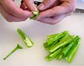 ししとうがらしはヘタを切り落とし、縦半分に切り分けて種と筋を取り除く。