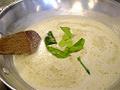 液体量は、なすの頭が少し出ている位で良い。ココナッツミルクだけで仕上げるのが本来の作り方であるが、牛乳を加える事により、あっさりと仕上がる。ただし、時として牛乳の中の乳脂肪分が凝固する事がある。