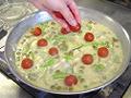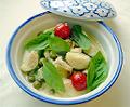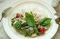 再び沸騰してきたら2種類のなすとグリーンペッパーを加え、ココナッツミルクまたは牛乳を注いで10分ほど煮込む。